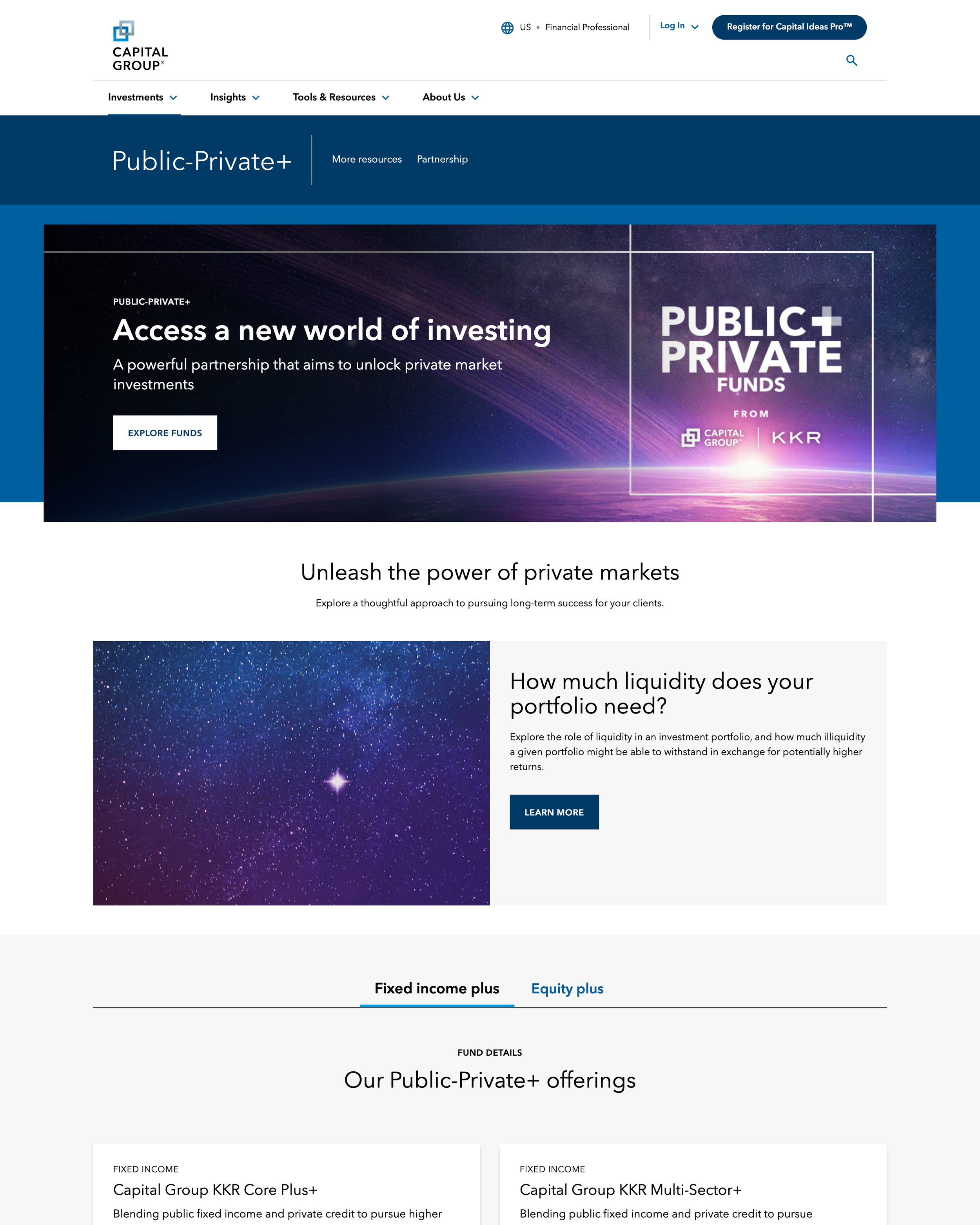 Capital Group x KKR — Public-Private+ brand launch. Co-brand identity, logo design, landing page, email campaign, and scalable design system. Design Lead · 2024–2025